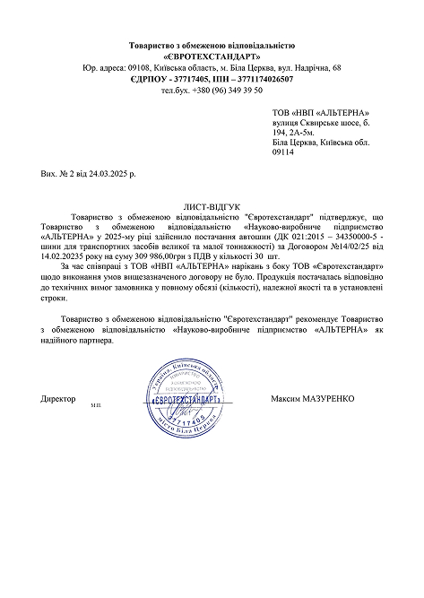Обираючи ТОВ НВП "АЛЬТЕРНА", ви отримуєте партнера, який розуміє важливість кожної деталі — від маленької прокладки до комплекту шин. Ми цінуємо свою репутацію, тому завжди виконуємо взяті на себе зобов'язання.